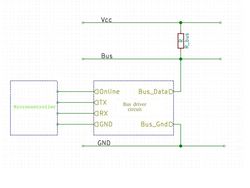 The UARTbus originally is designed to connect nodes using only one wire (or one pair) which is pulled up with a resistor R_bus to a maximal U_bus_max voltage.